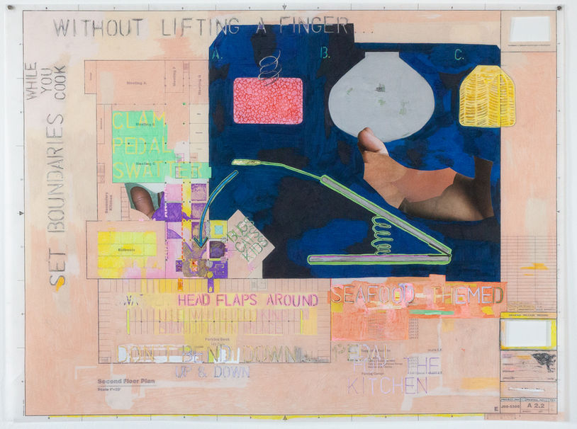Images of family, colored pencil, paint marker on architectural blue print