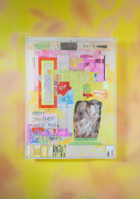 Photographs of family, colored pencil, paint marker on architectural blueprint